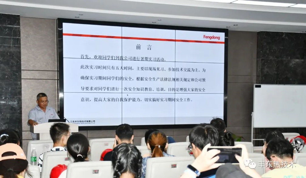 欢迎会结束后,江苏丰东热技术有限公司行政管理部注册安全工程师管其学为南航学生们进行了《热处理行业安全知识》的专题讲座,强调了生产见习过程中的安全要求,增强学生们的安全意识。